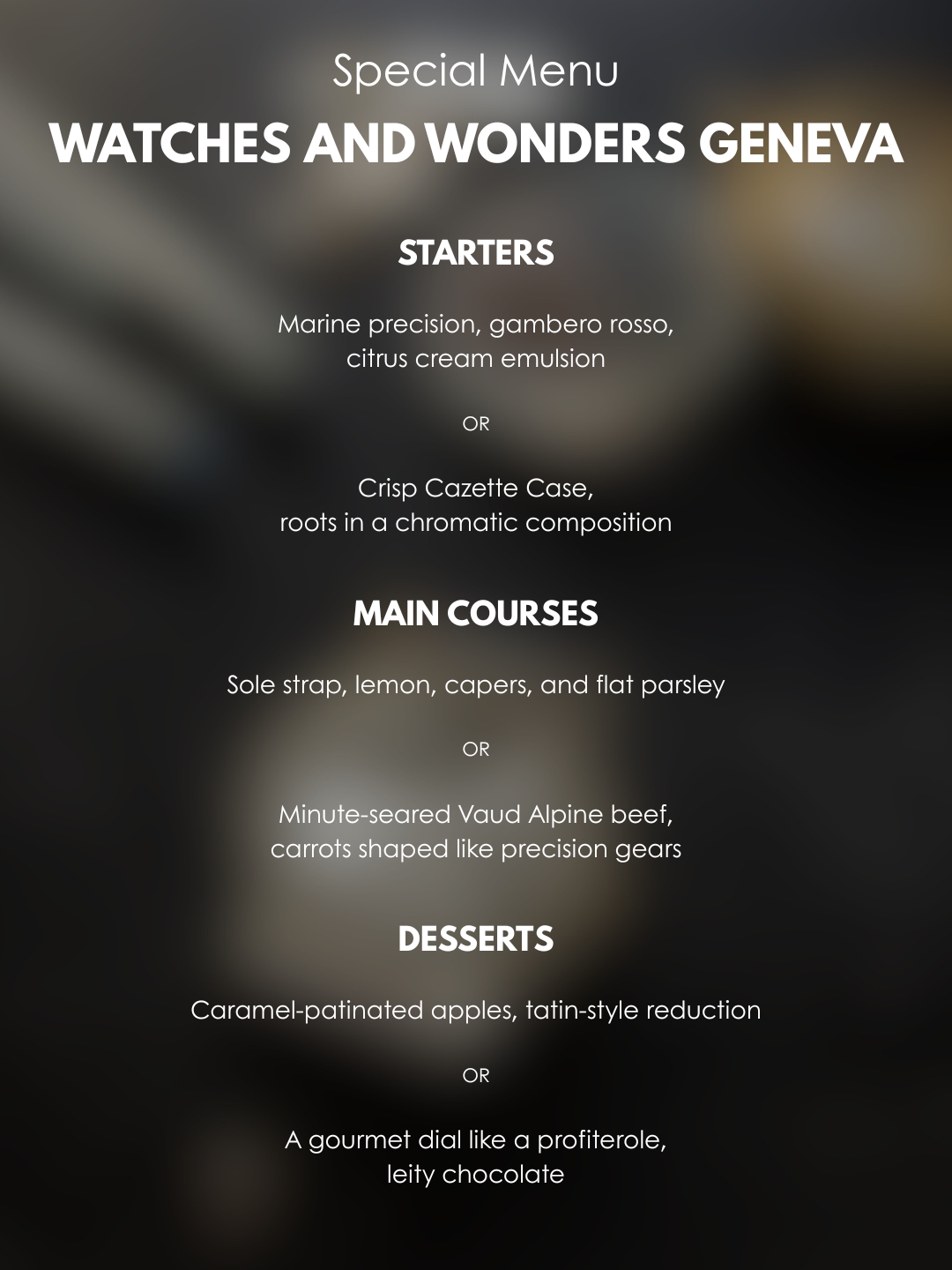 An exclusive menu priced at CHF 120, where every dish showcases attention to detail, craftsmanship and elegance.